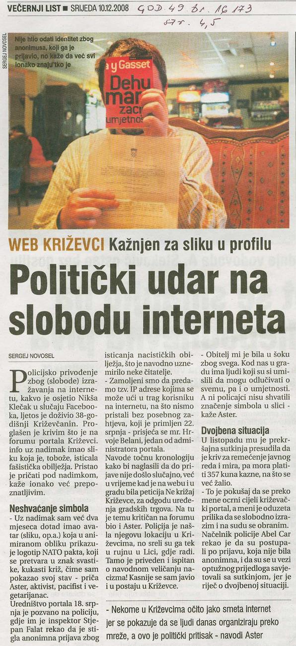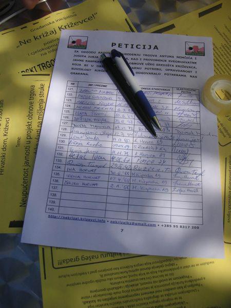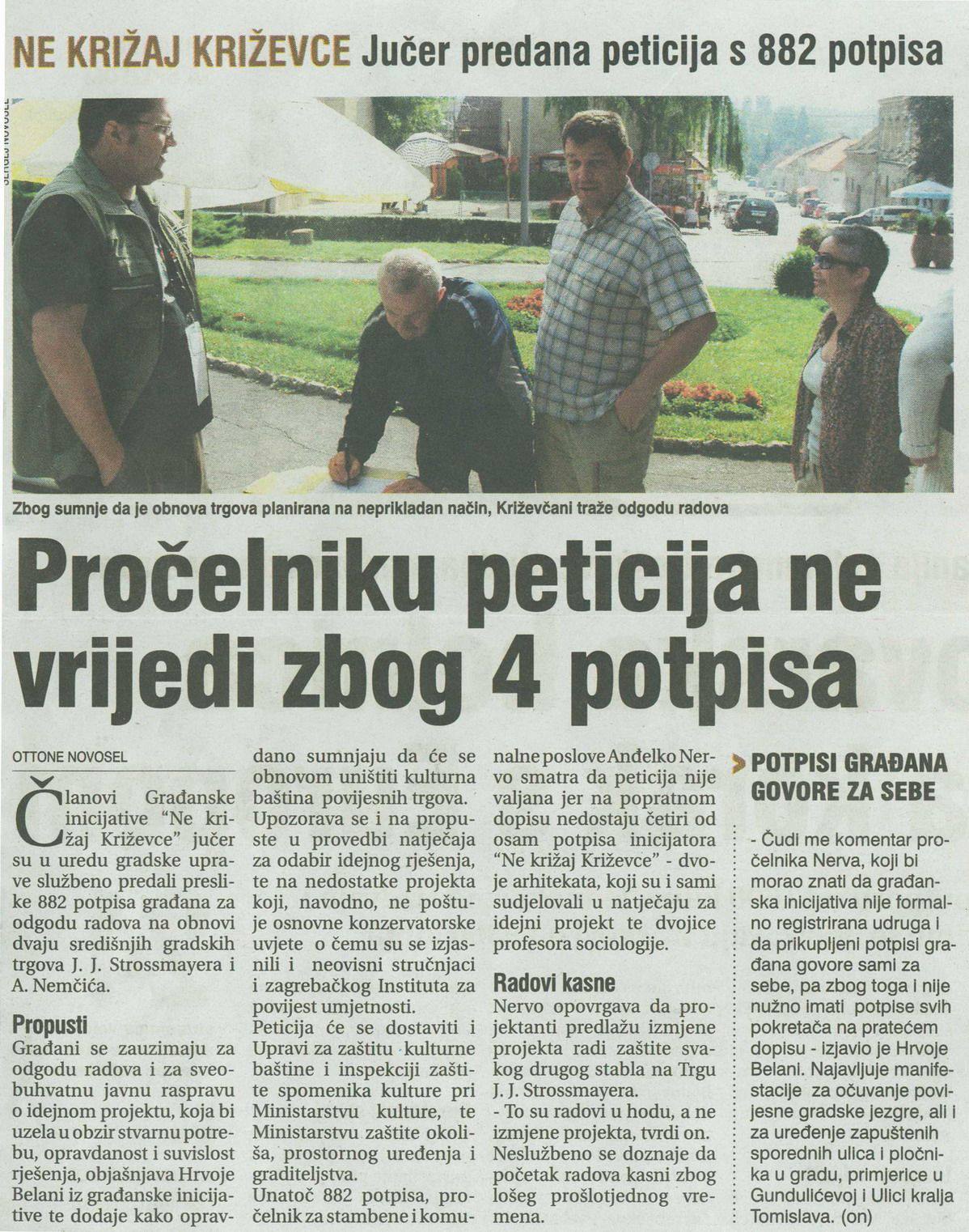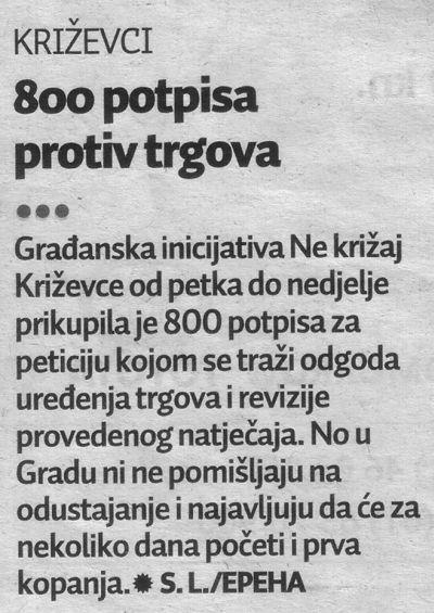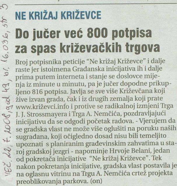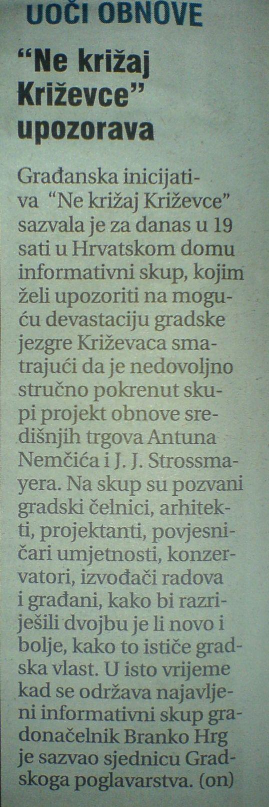 2010. godine publikacija „Ne križaj Križevce: kronologija građanske inicijative“ (ISBN 978-953-99805-2-6, CIP zapis pri NSK pod brojem 732810) pripremljena je i tiskana u nakladi 1000 primjeraka, na 36 stranica + 8 stranica bogatog foto-priloga u boji koji prikazuje središnje križevačke trgove A. Nemčića i J.J. Strossmayera nekad, za vrijeme građevinskih radova i uništavanja kompletne vizure i „zelene duše grada“ te današnjeg izgleda.